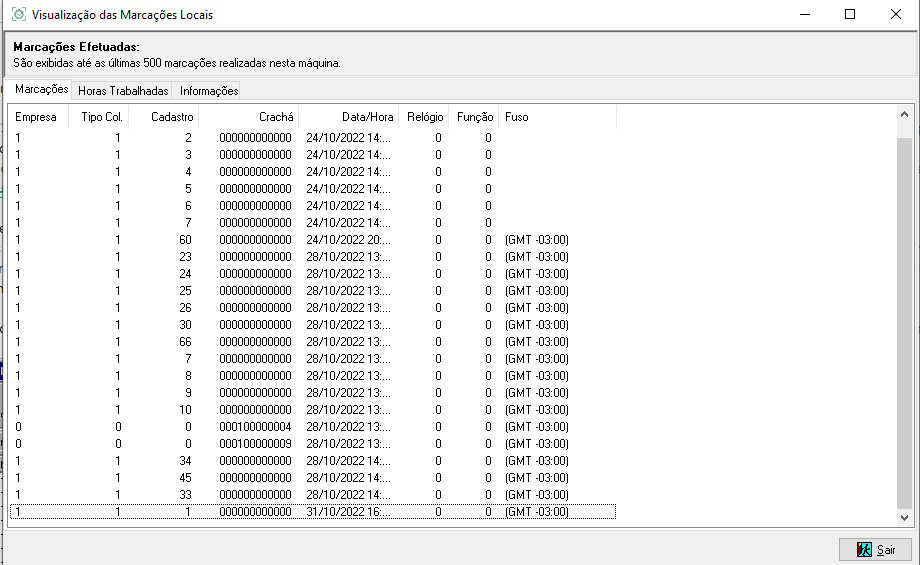No exemplo anterior, a configuração estava definida para que o colaborador visualizasse suas últimas 200 marcações. Este tipo de consulta é útil, pois somente irá exibir as marcações que o usuário realizou em sua máquina, sendo que na consulta dos Arquivos de Marcações, são exibidas as marcações de todos os colaboradores. Desta forma, fica a critério da empresa a decisão de qual consulta disponibilizar para seus colaboradores.