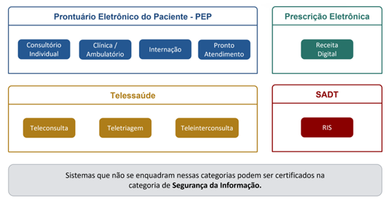 As categorias e modalidades certificáveis apresentadas na imagem podem ser verificadas na seção Categorias e Modalidades Certificáveis do manual da Sociedade Brasileira de Informática em Saúde.