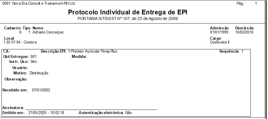No sistema, os EPIs que devem ser utilizados pelos empregados são identificados individualmente (colaborador), ou por atividade e Grupo Homogêneo de Exposição (GHE). O Segurança faz a distribuição dos equipamentos de forma individual ou coletiva, e dispõe de dois mecanismos para autenticação da entrega: impressa (impressão dos comprovantes de entrega e coleta de assinatura) ou eletrônica (por biometria ou senha). O módulo controla também os CAs e os treinamentos dos colaboradores para uso dos equipamentos. Para utilizar a biometria, consulte a documentação do Gestão de Pessoas | HCM para confirmar os modelos de leitoras biométricas compatíveis com a distribuição de EPIs do sistema.
