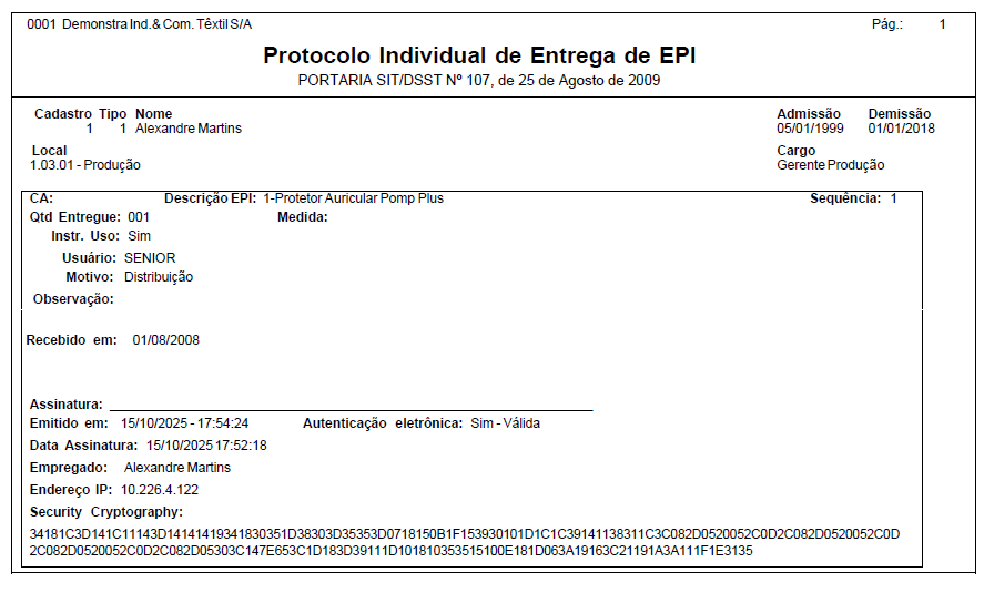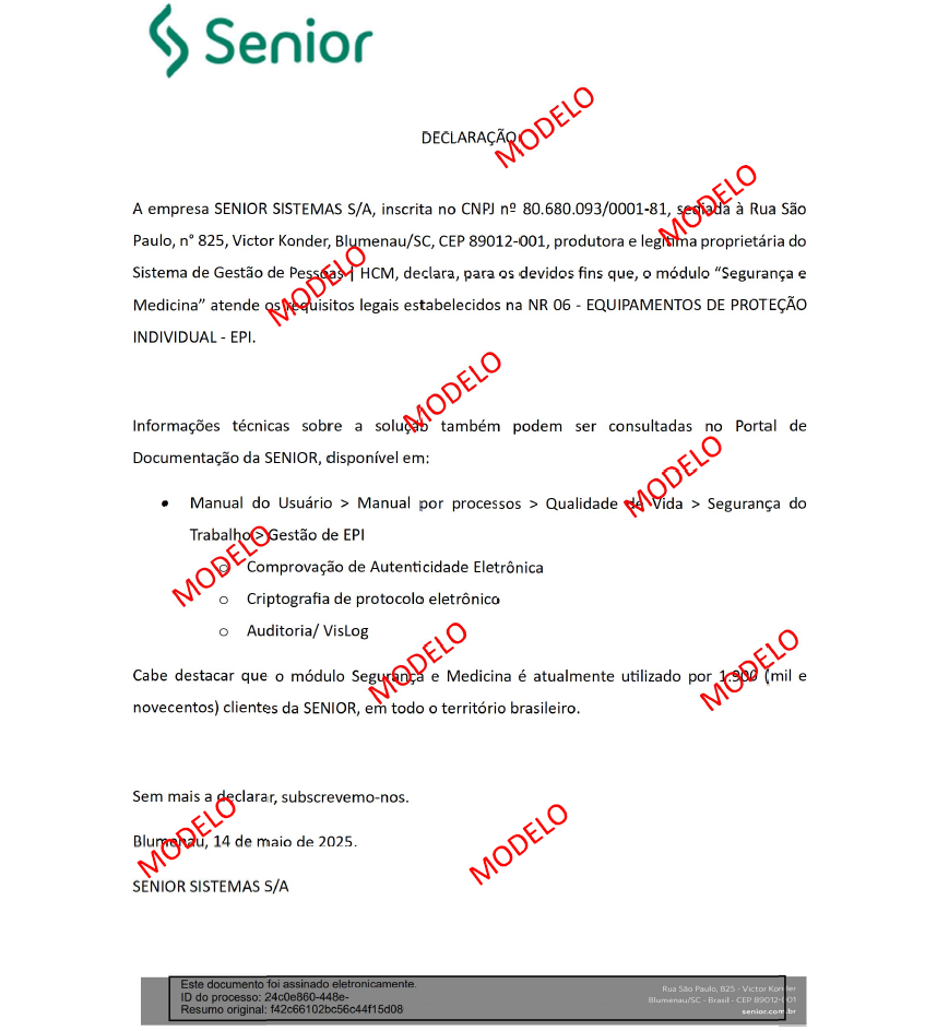 No sistema, os EPIs que devem ser utilizados pelos empregados são identificados individualmente (colaborador), ou por atividade e Grupo Homogêneo de Exposição (GHE). O Segurança faz a distribuição dos equipamentos de forma individual ou coletiva, e dispõe de dois mecanismos para autenticação da entrega: impressa (impressão dos comprovantes de entrega e coleta de assinatura) ou eletrônica (por biometria ou senha). O módulo controla também os CAs e os treinamentos dos colaboradores para uso dos equipamentos. Para utilizar a biometria, consulte a documentação do Gestão de Pessoas | HCM para confirmar os modelos de leitoras biométricas compatíveis com a distribuição de EPIs do sistema.