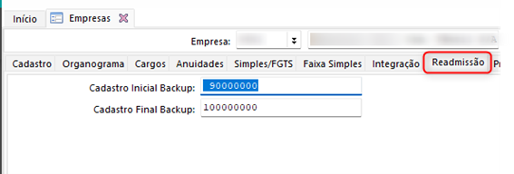 - Na tela Empresas (FR030EMP), acesse a guia Readmissão e insira a numeração inicial e final de backup que será utilizada nas reintegrações futuras.