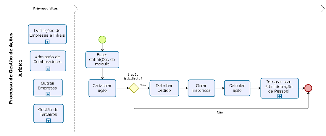 O processo de gestão de ações é o processo macro do módulo Jurídico. Nele são cadastradas as ações movidas pelas partes contrárias à empresa.