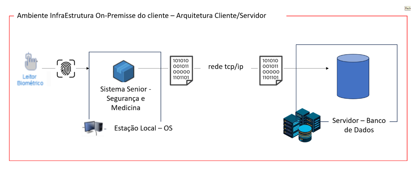 Nesse modelo, a leitora biométrica está conectada diretamente à máquina do usuário e o sistema operacional Windows gerencia o dispositivo. A comunicação ocorre de forma local entre o módulo Segurança e Medicina e a leitora, sem uso de serviços intermediários.