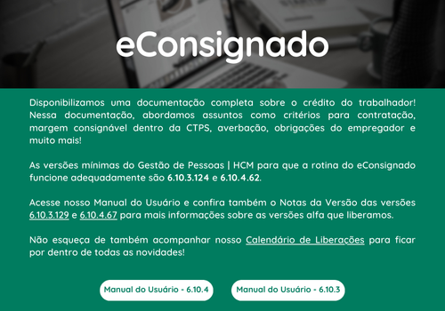 Devido à descontinuação da versão 6.10.3, ocorrida em 30/09/2025, as matérias relacionadas a essa versão não estão mais disponíveis em nossas Notas da Versão desde 01/10/2025. Para mais informações sobre a evolução do Gestão de Pessoas | HCM, consulte a documentação da PCVV - Política do Ciclo de Vida das Versões.