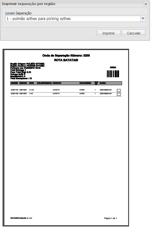 Numa nova janela, o sistema questionará qual relatório que será impresso, selecionando uma região em específico, ou imprimindo todos os relatórios com quebra ou não de página, exibindo nestes relatórios de Separação os endereços de origem e endereços de destino com seus produtos, embalagens e quantidades.