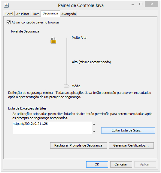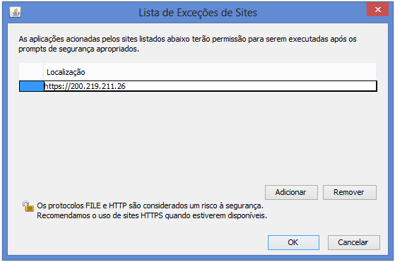 Para imprimir nos endereços das Impressoras configuradas, faz necessário a instalação do Java 7 de 32 bit´s na Estação de Trabalho. Para isso acesse o menu do Windows > Painel de Controle > Java > aba Segurança > botão Editar Lista de Sites / botão Adicionar.