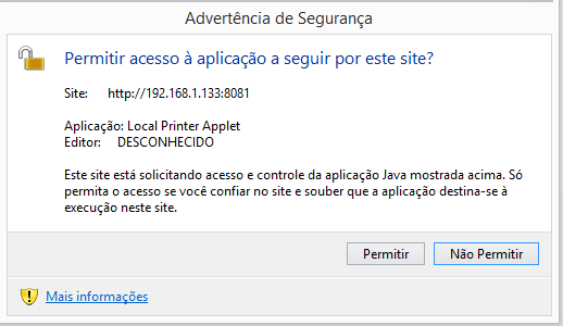 Permissões do Applet: se o pré-requisito acima for corretamente configurado ao acessar a tela de Montagens de Volume da Colmeia e estiver configurada para utilizar alguma impressora padrão as telas de alerta de segurança abaixo deverão aparecer. Caso a colmeia não utilize impressoras padrão, configuração realizada no Cadastro Armazém > Colmeia > Cadastro > Sub Menu: Outras > parâmetro: Utilizar Impressora Padrão para Presentes, Volumes e/ou DANFE, esta tela não será exibida na inicialização, somente será exibida caso a tela de definição de impressoras padrão for acessada. Para correta execução da funcionalidade de impressão automática o usuário deverá executar o applet e permitir o acesso à aplicação quando solicitado.