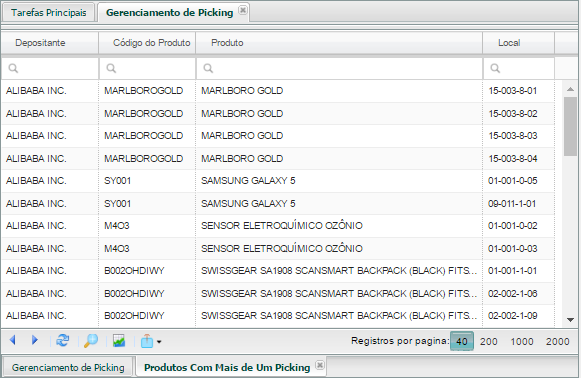 O sistema traz a visão dos pickings por local, produto, e depositante. Note que um mesmo local pode ser picking de outro produto, desde que o produto pertença ao mesmo depositante.