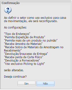 - Ao definir o setor como uso exclusivo para caixa de movimentação, os parâmetros abaixo serão reconfigurado. Deseja continuar?