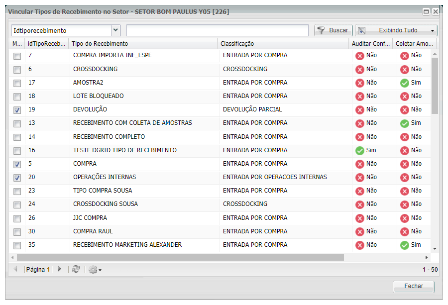 Serão exibidos todos os Tipos de Recebimento, e ao ativar a flag do início do registro, o tipo de recebimento estará associado ao Setor selecionado.