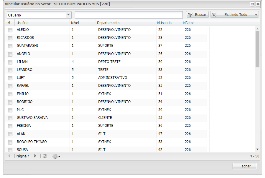 Abrirá janela para vincular os Usuários ao Setor selecionado, caso não vincule nenhum usuário, todos os usuários do sistema poderão realizar atividades neste setor.