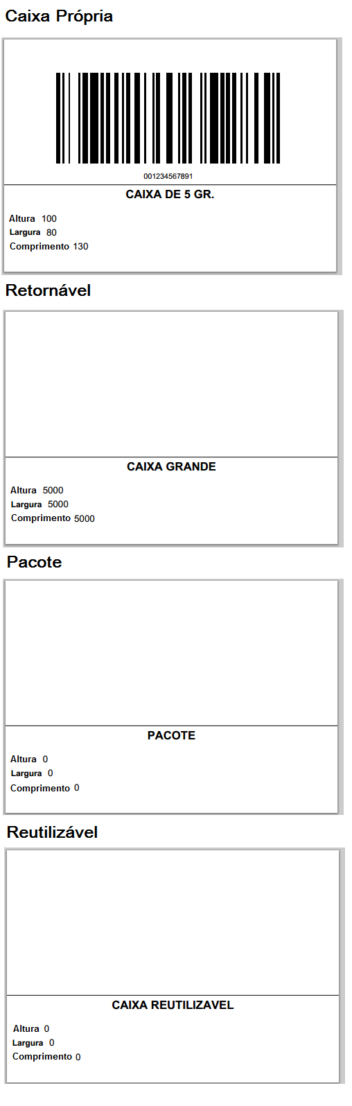 Na imagem abaixo estão exibidas as etiquetas do tipo Própria, Retornável, Pacote e Reutilizável.