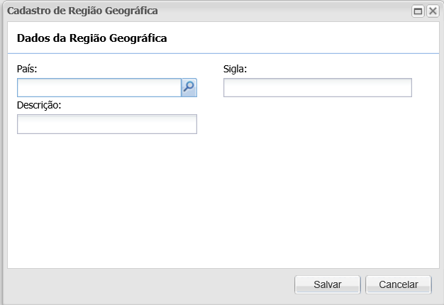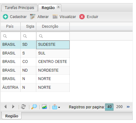 Esta tela é responsável em agrupar o país as suas regiões, onde a região poderá ser classificada como por exemplo: Norte, Sul, Sudoeste, Centro-Oeste e Noroeste e que por sua vez poderão ser vinculadas ao Cadastro da Entidade.