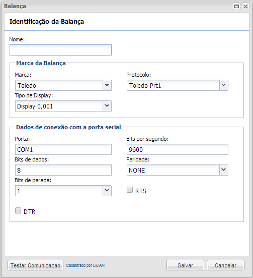 - Nome: descrição do nome da balança.