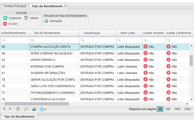 Menu: Cadastro > Entrada > Tipo de Recebimento