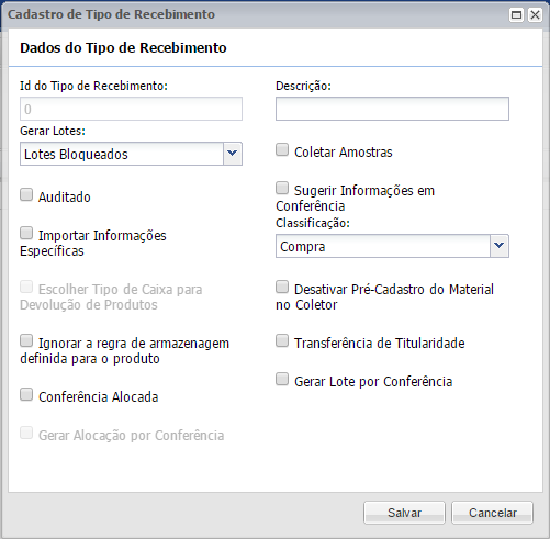 - Só será possível a ativação do parâmetro Gerar Lote por Conferência se a classificação do Tipo de Recebimento for igual a: Compra, Devolução Parcial, Devolução Total ou Reentrega.