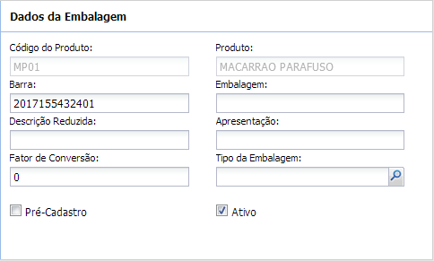 - Tipo da Embalagem: seleciona o Tipo de Embalagem, exemplo: Unidade, Caixa, Pacote, registros previamente cadastrados na tela Tipo de Embalagem.