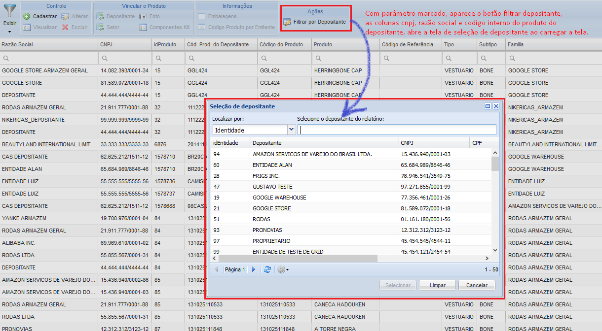 Utilizado para definir quais depositantes e suas particularidades trabalharão com o produto selecionado.