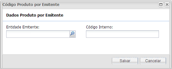Ao clicar no botão Cadastrar abrirá subtela cadastrar Código Produto por Emitente, onde o usuário pesquisará a entidade do Emitente e informará o Código do Produto.