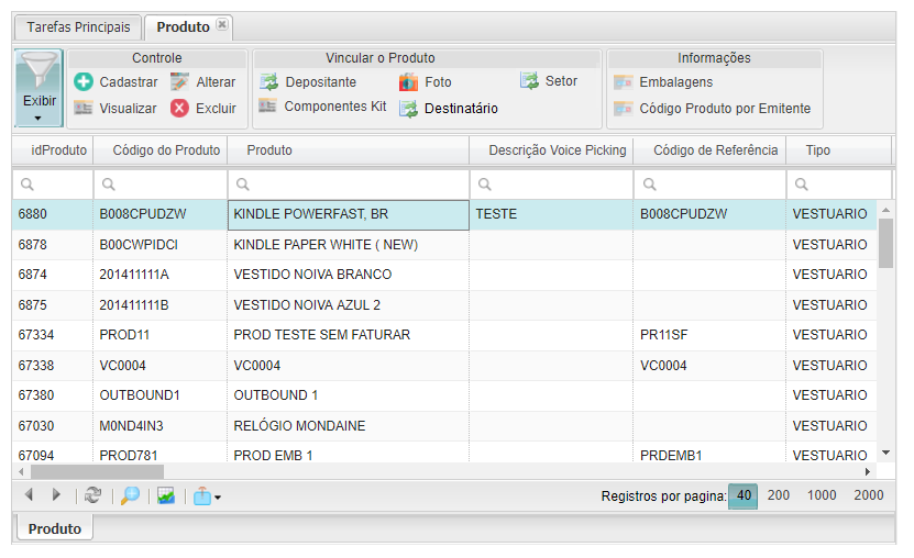 Esta tela exibirá o cadastro de produtos utilizados pelo armazém. A partir desta tela poderão ser realizados os cadastros de produtos e embalagens, as diversas configurações de campos e parâmetros.