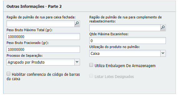 - Os campos Região de pulmão de rua para caixa fechada e Região de pulmão de rua para complemento de reabastecimento (sub menu Outras Informações – Parte 02), ficarão nulos e