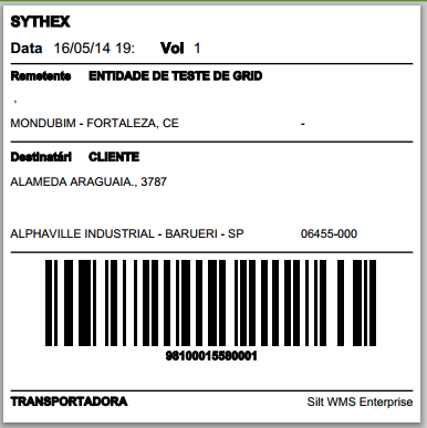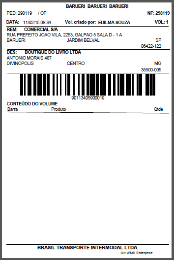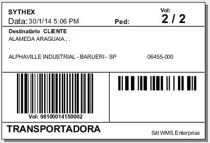 - Sem Conteúdo do Volume Mod. 8: etiqueta com as dimensões altura 70mm X largura 105mm. Criada a partir da versão 8.10.0.0, e que faz referência a expedição por volume. Será impressa automaticamente nas rotinas de Packing, Colmeia e Gerenciador de Volume.