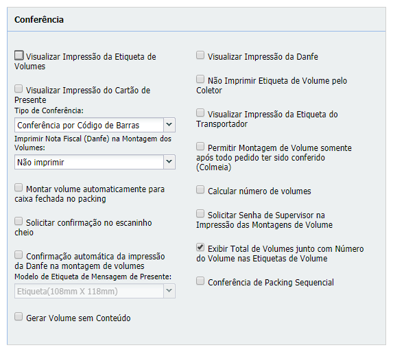 - Permitir Montagem de Volume somente após todo pedido ter sido conferido (Colmeia): a partir da versão 7.3.0.0, irá impedir o início da montagem de volumes na colmeia enquanto existirem produtos pendentes de conferência em um escaninho.