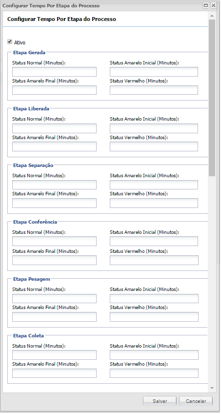 - Os minutos serão sequenciais, ou seja: Status NORMAL será inferior aos demais status, o Status Amarelo inicial será inferior ao Amarelo final e logo após ao Status Vermelho.