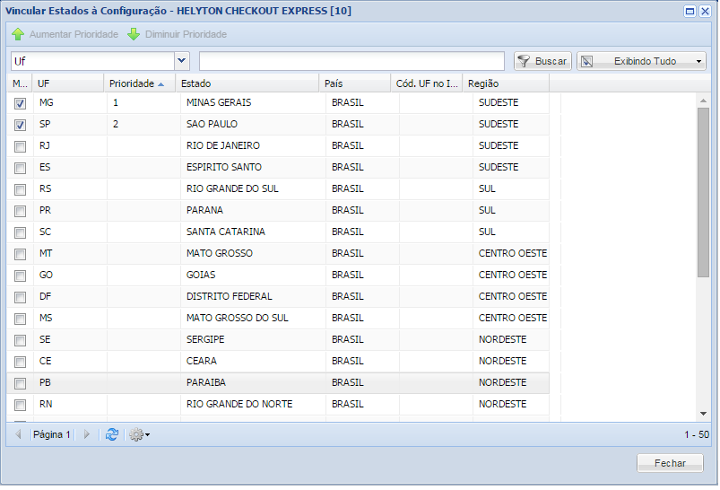 Funcionalidade criada a partir da versão 7.6.0.0 e terá relacionamento com o parâmetro Ordem de utilização de prioridade localizado no Sub Menu Checkout Express. Caso um estado for desvinculado, todas as prioridades seguintes serão reordenadas de modo a ocupar o número deixado pela remoção do vínculo. Caso exista mesmo valor de prioridade, o sistema reordenará automaticamente as prioridades, deixando o novo vínculo na posição escolhida e moverá todo o resto para um número maior no campo prioridade. Este campo receberá número inteiro maior que zero.