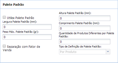 - Peso Máx. Palete Padrão (gr): peso máximo suportado pelo palete escolhido para alocar os produtos para a expedição.