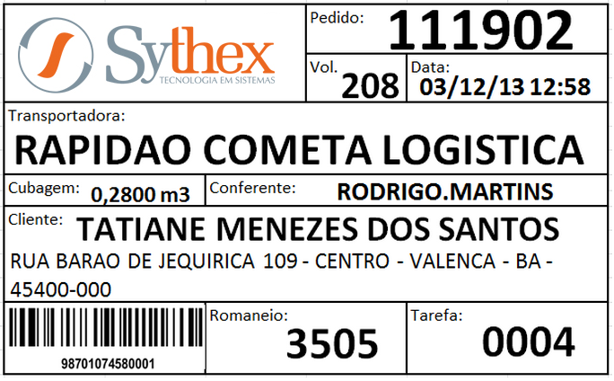 - Por exemplo: Pedido (0111902) + Volume (0208) + Rota (720/156) = 01119020208720/156.