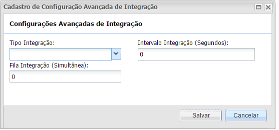 Será aberta uma tela para que o usuário defina o Intervalo de Integração (Segundos) e Fila de Integração (Simultânea) não podendo ser menor ou igual a zero. Ao realizar uma alteração, uma mensagem de alerta será exibida informando ao usuário o tempo máximo que as alterações entrarão em vigor.