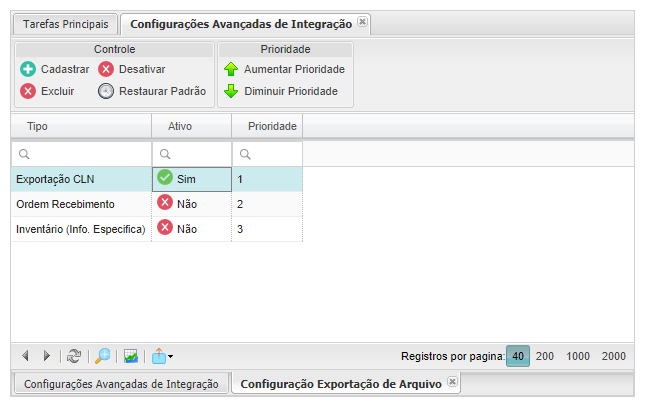 Estará habilitado se a linha selecionada for do tipo Exportação. A tela listará todos os layouts de exportação que o sistema integra, e exibirá todos os registros marcados e Ativos, porém com prioridade nula. Dessa forma o usuário poderá desmarcar (inativar) a exportação de determinado tipo de arquivo. Terá os botões Aumentar Prioridade e Diminuir Prioridade que definirá a prioridade de exportação dos arquivos que serão inseridos na pasta de exportação.