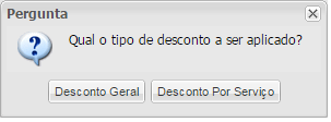 Para efetuar o abatimento dos valores apurados com a inclusão de um desconto. Após gerada a fatura, selecione na tabela a fatura para a qual deseja incluir o desconto. Selecionando o botão “Desconto Fatura” o sistema mostrará uma janela perguntando se deseja incluir um Desconto Geral ou Desconto Por Serviço.