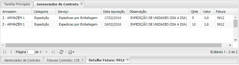 Em Detalhes da Fatura os dados analíticos serão listados agrupados por Armazém, Categoria: Armazenagem, Expedição, Recebimento e Serviços Avulsos. Sendo listados a Quantidade e o Valor Bruto, por dia para cada um dos serviços prestados, com a descrição cadastrada no momento da parametrização do contrato.