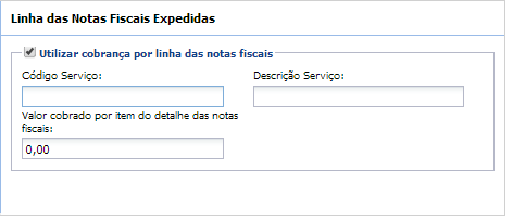 Utilizar para cobrança por linhas separadas. Critério utilizado com base nos itens de cada pedido ou nota fiscal independente do valor. Importante Ativar o serviço no check-box “Utilizar cobrança por linha das notas fiscais”, definir o valor por item no campo: “Valor cobrado por item do detalhe das notas fiscais”.