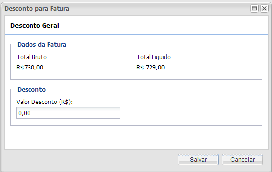Caso o parâmetro “Permitir Desconto “ estiver desabilitado o botão “Desconto Fatura” não poderá ser acionado, ficando assim desabilitado. Caso o mesmo esteja habilitado será possível aplicar um Desconto Geral ou Desconto Por Serviço porém este desconto não poderá ultrapassar o percentual máximo permitido definido no contrato.