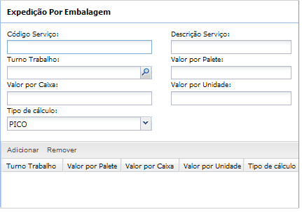 Utilizar para cobrança de serviços de expedição (separação, conferência, packing, embarque), nesse critério o sistema utilizará do valor do documento de movimentação para cálculo do serviço de expedição. Sendo possível definir valores diferentes por turno de trabalho. O turno de trabalho deverá ser parametrizado previamente no cadastro de turno de trabalhos.