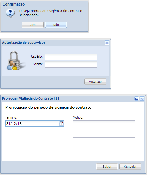 A Data Início da Vigência do Novo Contrato será a data posterior a data de término do contrato selecionado e a data de término será calculada de acordo com o período de vigência do contrato selecionado. Para efeito de rastreabilidade foi criada coluna para exibir qual contrato originou o novo contrato.
