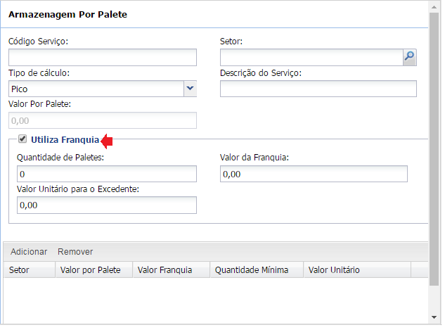Utilizar para cobrança de endereços/posições ocupadas. Nesse critério será a quantidade de endereços ocupados que será utilizado para o cálculo do serviço de armazenagem. Sendo possível definir valores diferentes por Setor de Armazenagem. Caso tenha sido acordado uma quantidade mínima de endereços basta definir o valor para a franquia bem como valores e tolerância para posições excedentes da prevista.