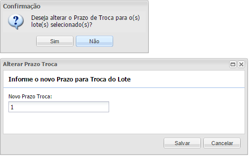 Permitirá a edição do prazo de troca do contrato atual do lote para o Contrato Substituto, por exemplo quando o depositante A negociou 45 dias para que o fabricante bancasse os custos de armazenagem, mas em negociação adicional o fabricante decidiu por bancar 60 dias dessa forma nessa tela o usuário poderá selecionar os lotes e alterar o prazo de troca. O sistema permitirá que o prazo seja alterado para no mínimo 1 dia.