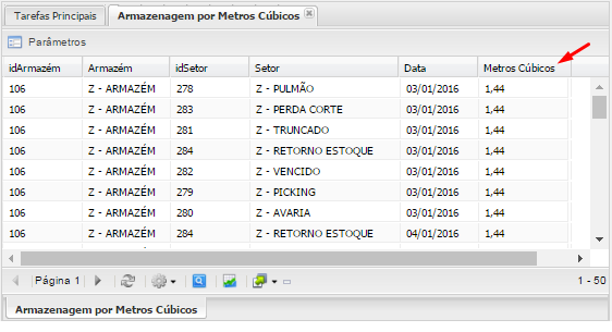 Desde a versão 8.0.0.0, foi criado relatório de Armazenagem por Metros Cúbicos, a partir do menu de Gestão de Contrato, onde será solicitado período, para exibir por setor e data os metros cúbicos, conforme a Data de Início e de Término do Contrato. A tela terá Consulta Dinâmica e o botão “Parâmetros” que auxiliará na filtragem dos registros no grid.
