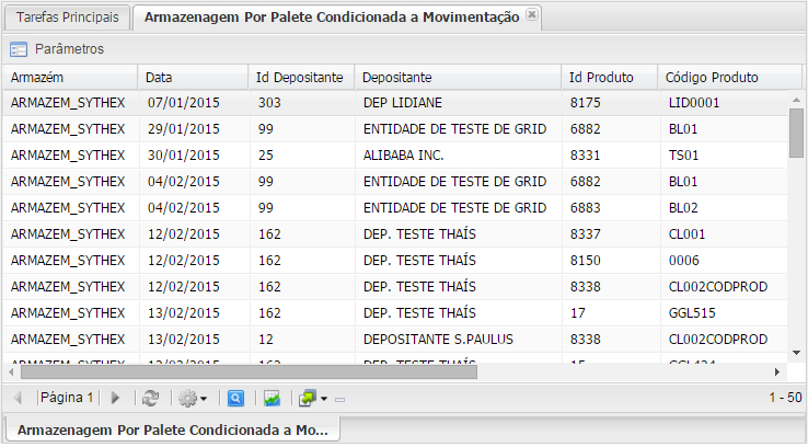 Desde a versão 8.0.0.0, foi criado relatório de Armazenagem Por Palete Condicionada a Movimentação, a partir do menu “Gestão de Contrato” que exibirá o detalhe da quantidade de peças movimentadas por produto do depositante do contrato. A tela terá Consulta Dinâmica e o botão “Parâmetros” que auxiliará na filtragem dos registros no grid.