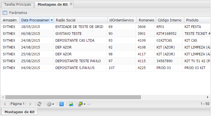 Desde a versão 8.0.0.0, foi criado relatório de Montagem de Kit, a partir do menu “Gestão de Contrato” que exibirá o detalhe da quantidade de kits montados do depositante do contrato. A tela terá Consulta Dinâmica e o botão “Parâmetros” que auxiliará na filtragem dos registros no grid.