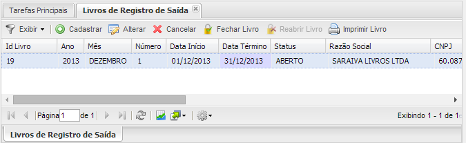 Esta tela contém os botões: Exibir com a possibilidade de selecionar os registros Abertos, Fechado e/ou Cancelados, os botões Cadastrar, Alterar e Cancelar, Fechar Livro, Reabrir Livro e Imprimir Livro.