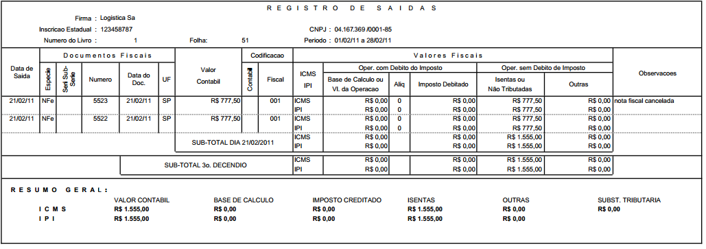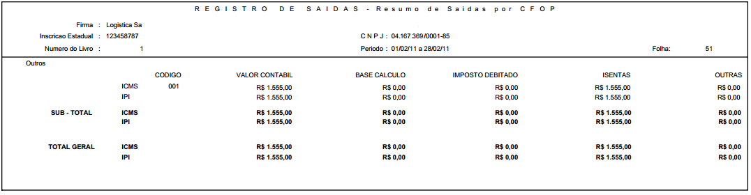 Registro de Saídas – Resumo de Saídas por Estado de Origem de Mercadoria