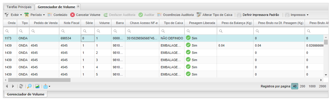 Esta tela apresentará os botões Exibir que mostrará os filtros que exibirá os registros: “Pesagem não Liberada”, “Pesagem Liberada” e/ou “Cancelado”, os botões Período, Conteúdo, Cancelar Volume, Desfazer Auditoria, Auditar e Imprimir Etiqueta.