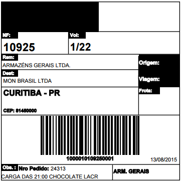 Menu: Impressos > Etiqueta Volumes Entrega (largura 100mm X altura 100mm)