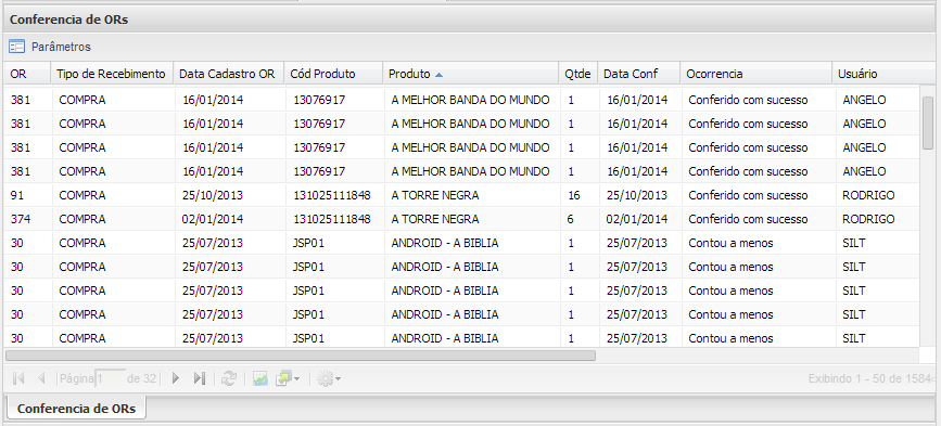 Serão exibidas todas as conferências realizadas por um ou mais OR (ordem de recebimento), conforme valores informados no Parâmetro.