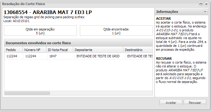 - Recusar : Se for recusado o corte físico de separação, a rotina retornará a quantidade cortada para separação sendo necessário realizar nova separação, a quantidade que era para ser cortada do item ficará marcada com o Corte Físico como recusado.